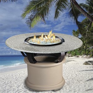 Granite:Pebble, Insert:Glo Fire Gas Logs, Finish:Sage Del Mar Series Bar Height 48' Fire Pit Table The Del Mar is truly an elegant creation. The base is streamlined and curved metal rises to meet the granite. The Del Mar provides ultimate choices in versatility with many different color combinations and a fire pit that changes easily to a grill table or a cooler table for your drinks. Replace any of these with the complementary granite insert that also has a 2? umbrella hole and you could be instantly sitting outside under the shade. The Del Mar Series comes standard with a 48' granite top and you may choose between many Arctic Flame glass colors or Glo Fire gas logs for your fire pit. Read more...
