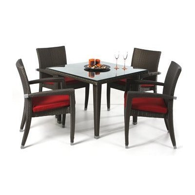 You will receive a total of 1 table and 4 chairs. Finish: Dark Brown. Material: Wicker strapping is woven from 100% virgin vinyl and hand wrapped for a natural feel. 1 Table with Glass Plate Top. 4 Arm Chairs with with decorative aluminum ferrules. UV inhibitors repel the damaging effects of the sun and harsh weather = MAINTENANCE FREE wicker. Frame made of heavy-gauge aluminum, guaranteed never to rust. Welded aluminum joints are ground and polished. PVC is a Semi-rigid, very tough, weatherproof, fire resistant material with good chemical resistance which repels water. PVC will not rot or mildew and requires no maintenance at all. Table: 35" x 35" x 29". Chair: 23.5" x 23" x 34.5". Seat 18" x 18" x 18" H. Arm Height: 25". Read more...